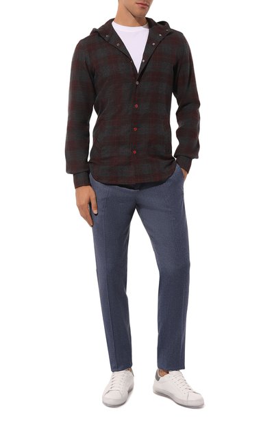 Прямые брюки с трикотажными вставками на поясе выполнили из костюмной шерсти. Модель с двумя врезными карманами по бокам дополнили парой накладных сзади.