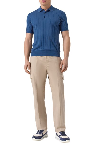 Брюки с брендированным патчем на цельнокроеном поясе сшили из твила на основе хлопка и шелка. Помимо боковых и задних карманов у модели предусмотрели пару карго.