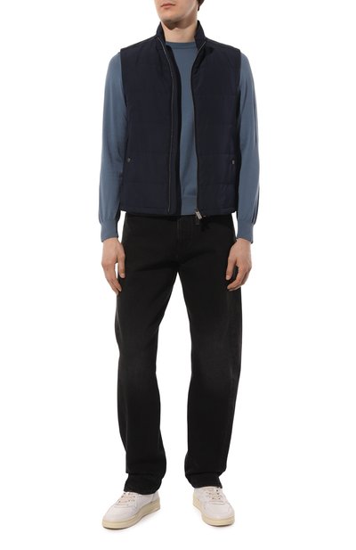 Для создания джемпера с круглой горловиной выбрали тонкий шерстяной трикотаж. Модель дополнили эластичными манжетами и поясом в рубчик.