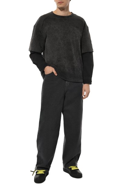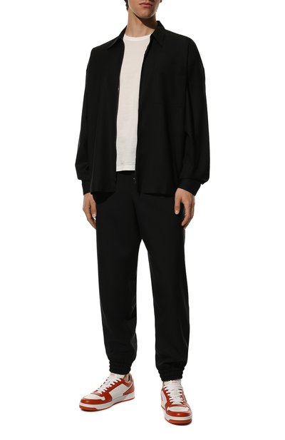 Высокие кеды Spiker из телячьей кожи украсили контрастным принтом, вписав в него аппликацию в виде звезд. Принадлежность пары бренду обозначили моногр аммой DSQ2 на язычке и логотипом на заднике. Модель с текстильной внутренней отделкой поставили на состаренную резиновую подошву.