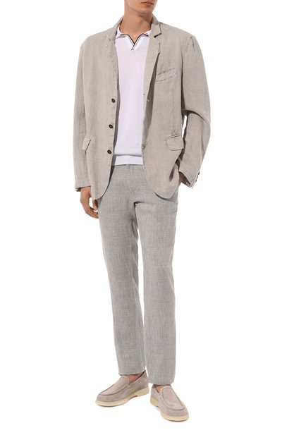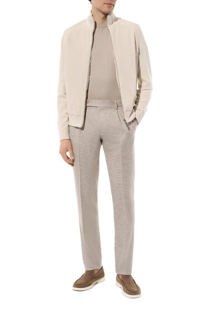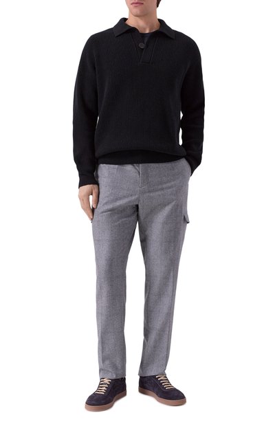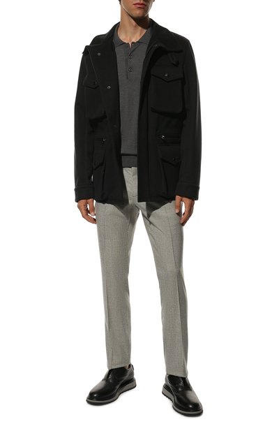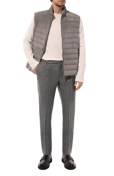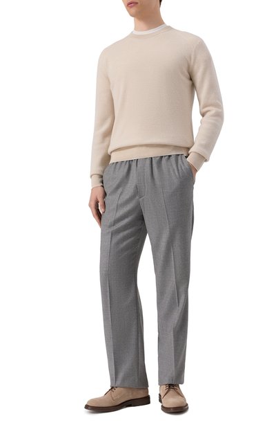 Брюки со стрелками и четырьмя карманами дополнили эластичной вставкой на поясе, обеспечивающей комфортную посадку. Для изготовления модели использовали стрейчевую шерстяную фланель.