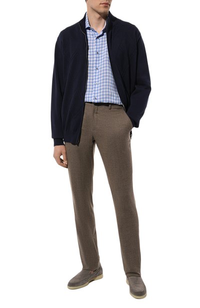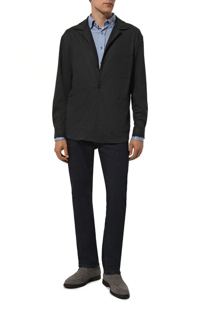 Рубашку с изогнутой линией низа и отложным воротником выполнили из микса хлопка и лиоцелла. Сама модель кроя Regular fit, как и скошенные манжеты, застегивается перламутровыми пуговицами.
