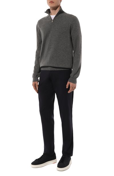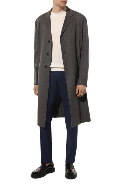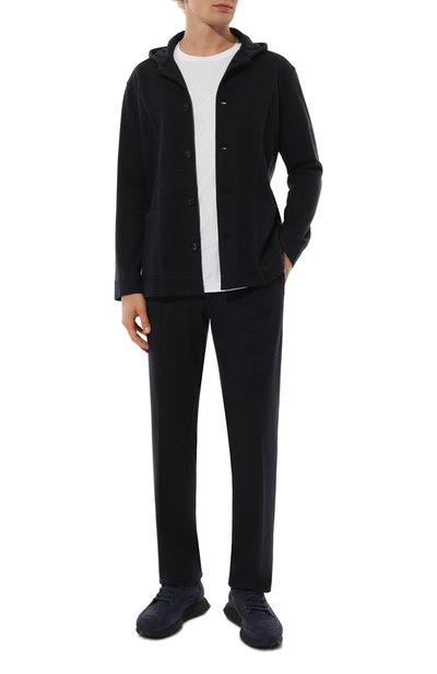 Укороченные брюки с отворотами и защипами сшиты из гладкой шерсти Fresco. Эластичный пояс-кулиска украшен сзади брендированным патчем. Модель со стрелками дополнена тремя карманами.