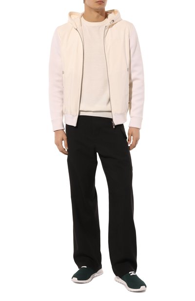 Кроссовки из стрейчевого трикотажа поставили на контрастную подошву, частично заходящую на мыс. Модель с пяточным стабилизатором и петлей на заднике украсили вышитым логотипом на язычке.