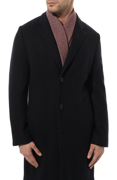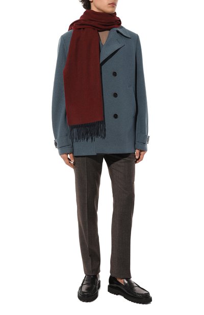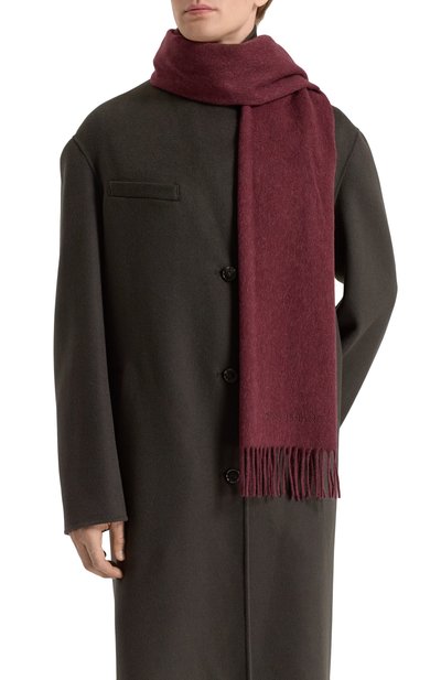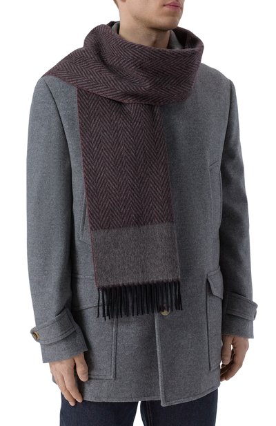 Шарф с короткой бахромой на краях выполнили из чистого кашемира. Нити материала окрасили в два оттенка, создав на аксессуаре меланжевый узор.