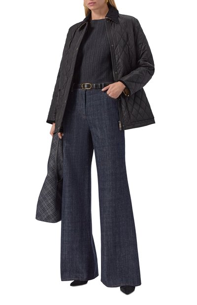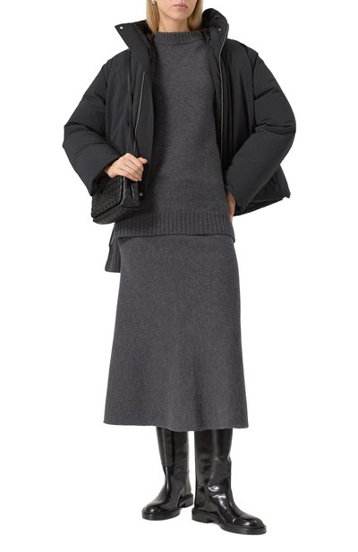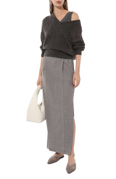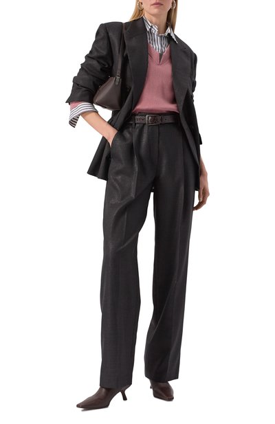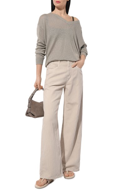 Пуловер со спущенной линией плеч и V-образной горловиной дополнили манжетами и поясом в рубчик. Модель с боковыми разрезами связали из льняной пряжи с добавлением шелка.