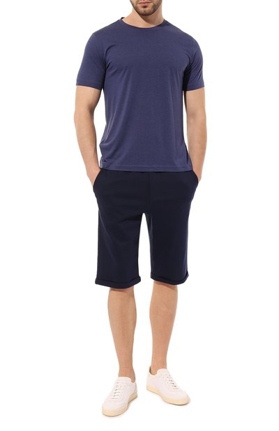 Прямые шорты с отутюженными стрелками сшили из хлопкового твила стрейч. Модель с эластичным поясом дополнили боковыми и задними карманами на молниях.