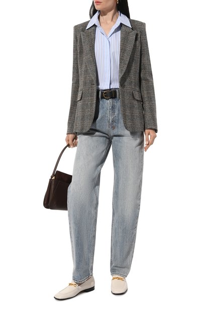 Джинсы Bibi с пятью карманами и изогнутыми внешними швами изготовили из жесткого денима. Чтобы слегка выбелить модель, украшенную брендированным патчем сзади, ее постирали с камнями.