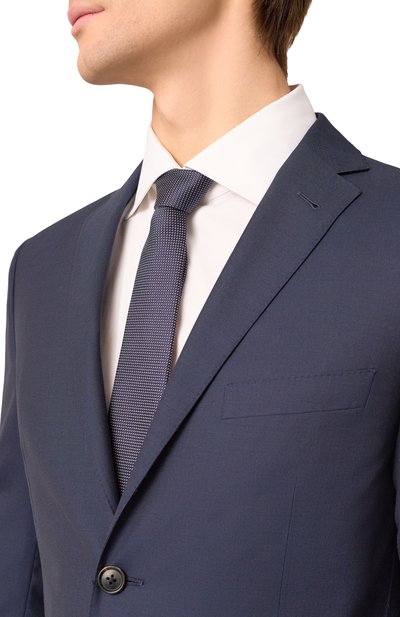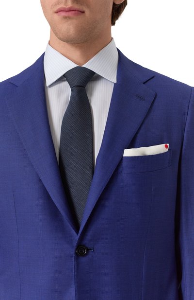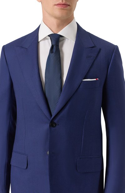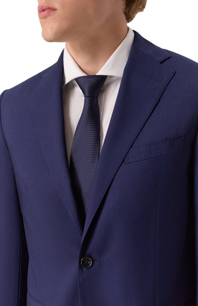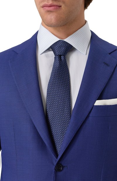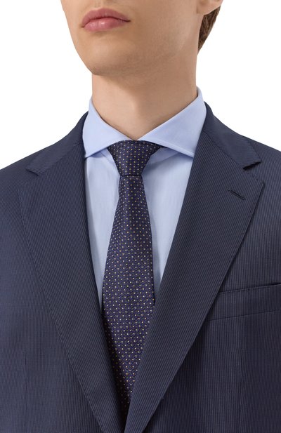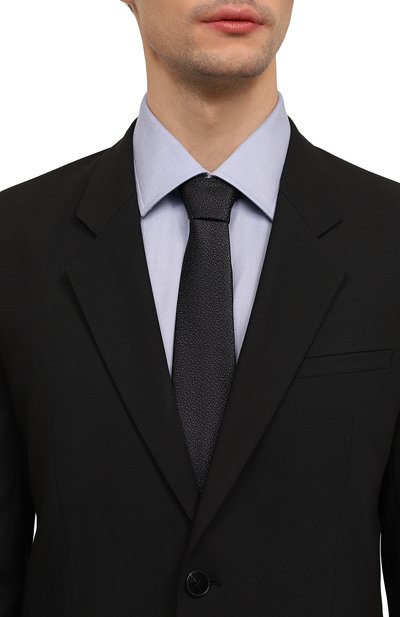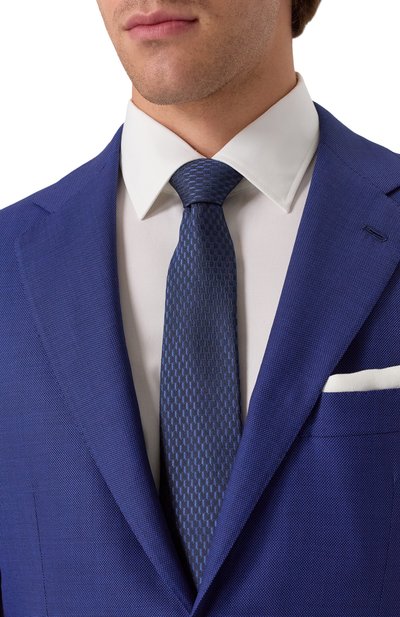 Галстук средней ширины выполнили из шелкового жаккарда с геометрическим микроузором. Чтобы аксессуар хорошо держал форму, ткань продублировали подкладом и зафиксировали эластичным ручным швом.