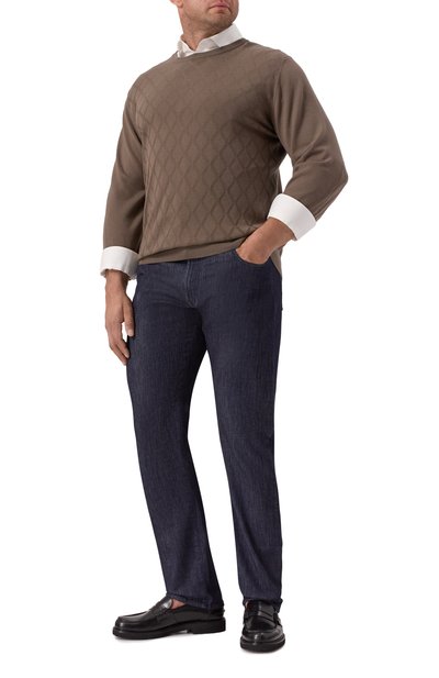 Джемпер с геометрическим узором спереди и на локтях выполнили из тонкой шерстяной пряжи. Модель с круглой горловиной, манжетами и поясом в рубчик подойдет для офиса с нестрогим дресс-кодом.