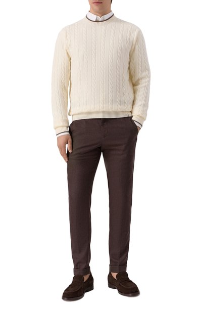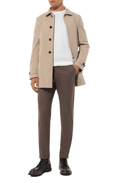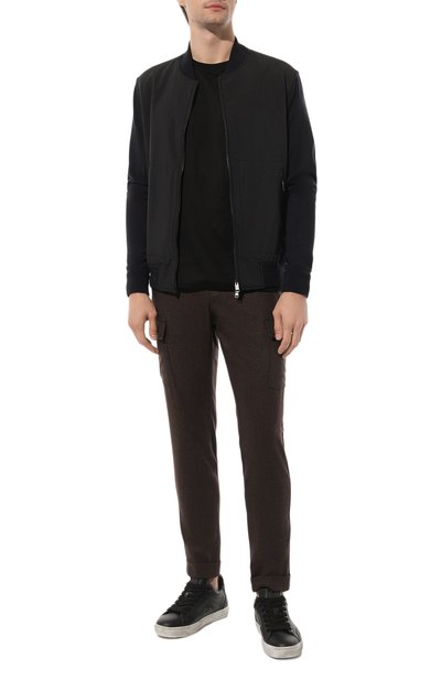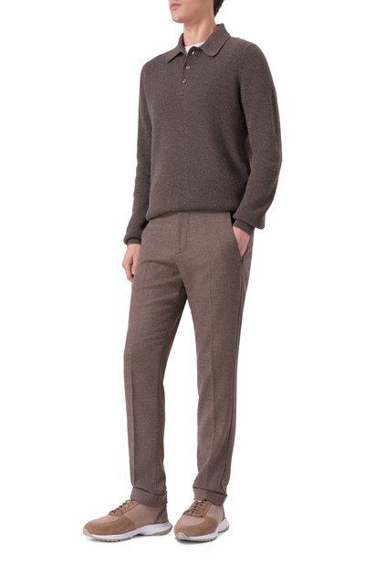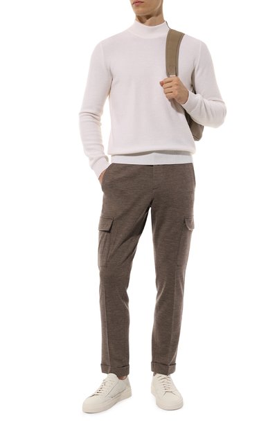 Брюки Tor с поясом-кулиской дополнили боковыми и задними карманами, а также парой карго с клапанами на кнопках. Модель с отворотами на брючинах сшили из микса шерсти и кашемира.