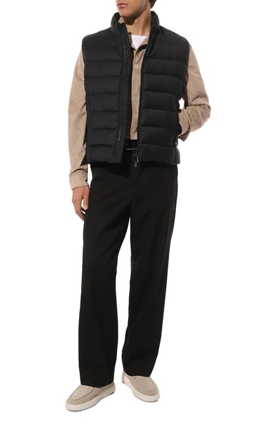 Жилет с боковыми прорезными карманами выполнили из шерсти с добавлением кашемира и эластана, дополнив изделие нейлоновой подкладкой. Под молнией на воротнике-стойке спрятали капюшон.