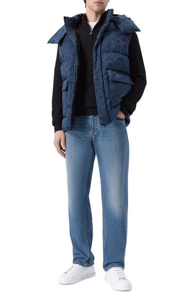 Хлопковый жилет с погонами напоминает куртку, у которой отрезали рукава, оставив необработанными края. Утепленную модель с трикотажными низом и воротником-стойкой дополнили двумя нагрудными карманами с клапанами и парой прорезных по бокам. Выбеленный оттенок и потертости придают изделию винтажный вид.