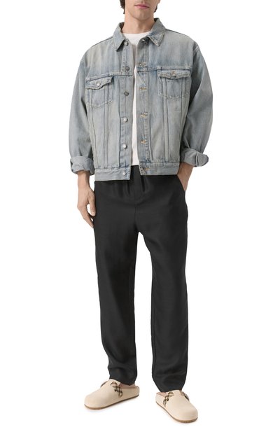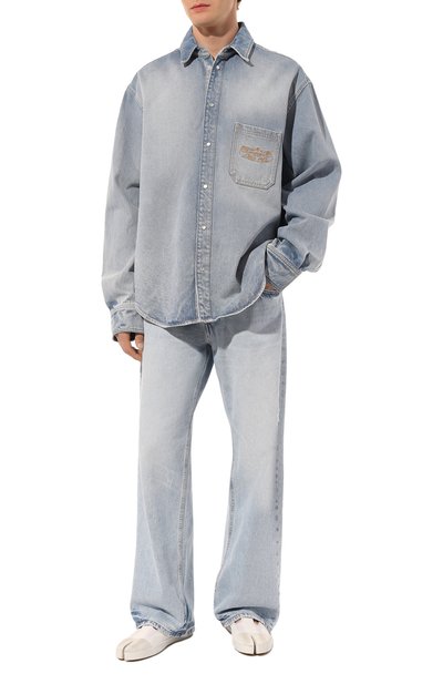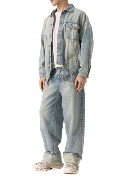 Куртку с регулируемыми патами на поясе сзади выполнили из неэластичного денима. Выбеленную модель с искусственными потертостями и загрязнениями декорировали вышитым числовым кодом спереди и фирменной белой строчкой на спинке.