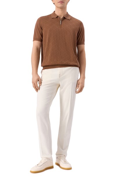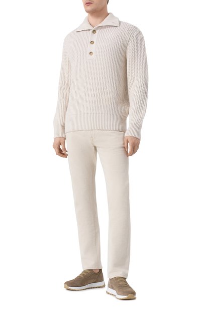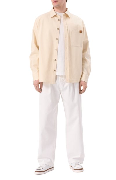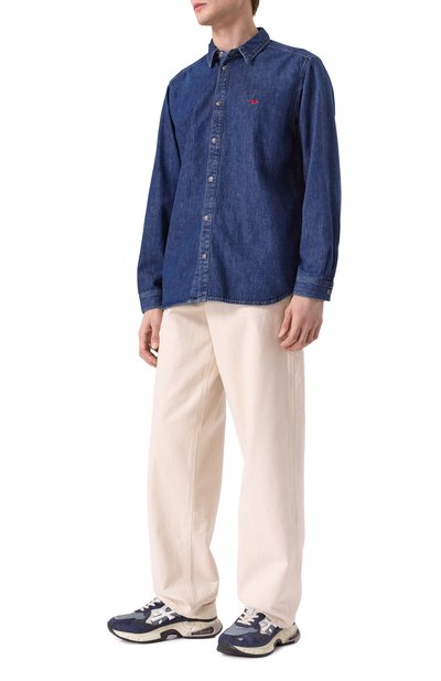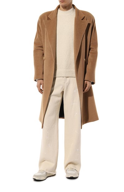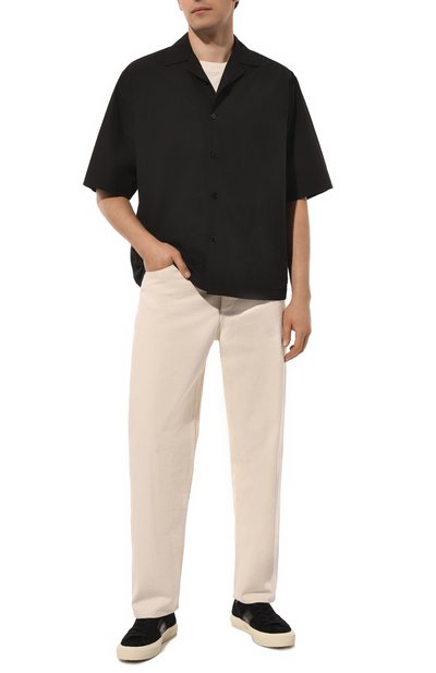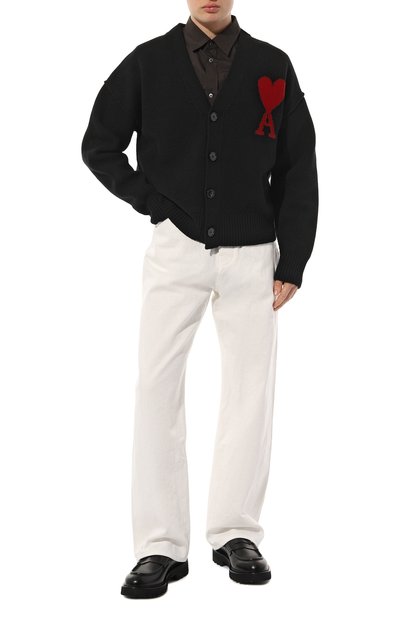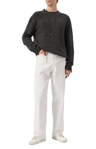 Джинсы с застежкой button fly изготовили из чистого хлопка. Модель украсили брендированным кантом на самом маленьком из пяти карманов и литерой М, сложенной из шлевок на поясе сзади.