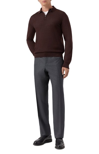 Поло с манжетами и поясом в рубчик сшили из кашемирового трикотажа с добавлением шелка. Модель застегивается тремя перламутровыми брендированными пуговицами на короткой планке.