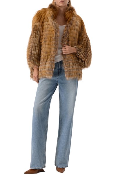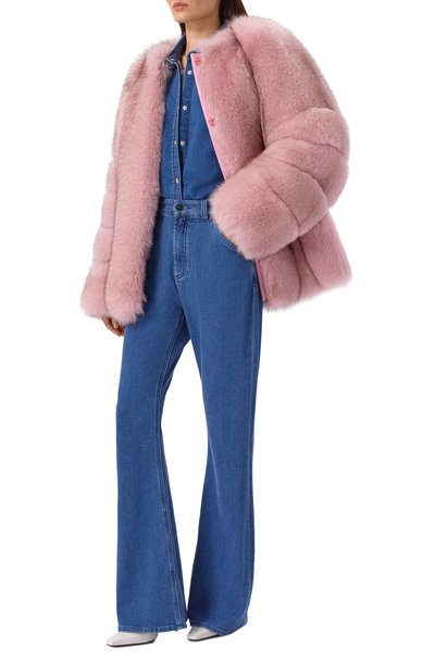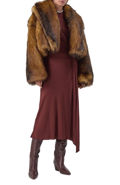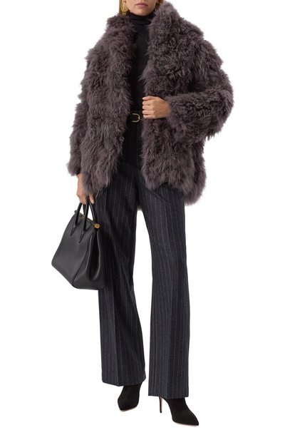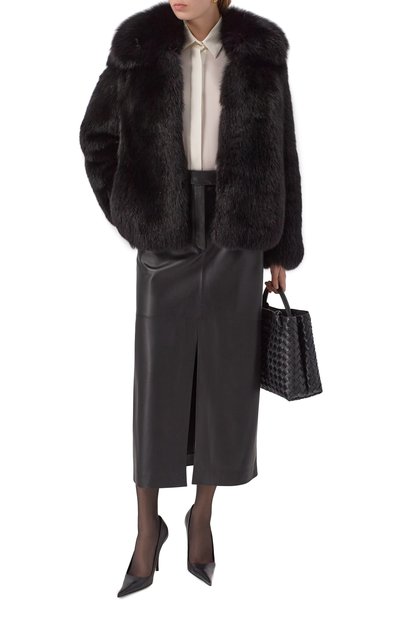 Укороченная шуба из густого меха козы впишется в образ как темной, так и светлой гаммы. Модель с боковыми карманами и широким воротником дополнили подкладом из микса ацетата и полиэстера.