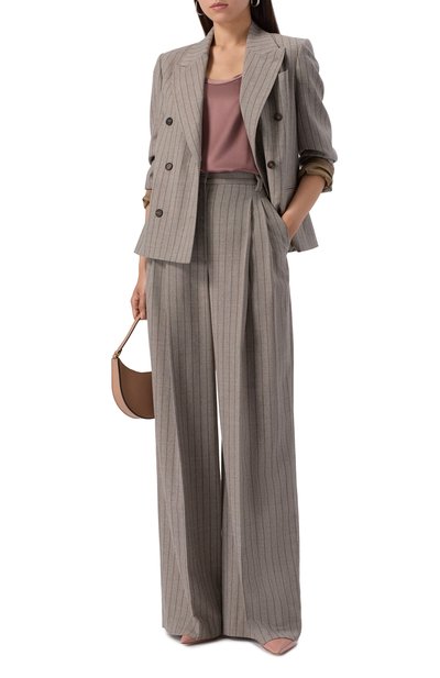 Расклешенный топ Garino с драпировкой вдоль вырезов спереди и сзади выполнили из ткани на основе хлопка и шелка. Из нее же изготовили объемный витой кант, играющий также роль бретелей.