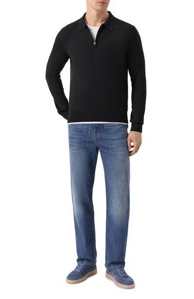 Слегка выбеленные джинсы с пятью карманами изготовили из эластичного хлопкового денима. Брюки с фирменной фурнитурой украсили жакроном с тисненым логотипом на поясе.