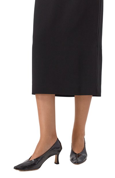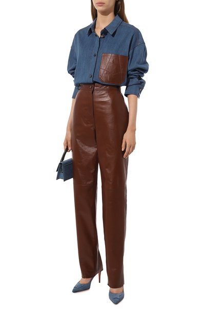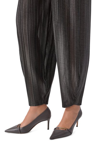 Туфли с удлиненным квадратным мысом изготовили из шерстяной фланели и отделали внутри гладкой кожей. Высокий каблук украшен фирменными цепочками мониль. Кожаную подошву дополнили нескользящей полимерной накладкой.