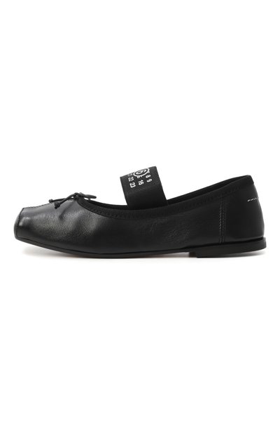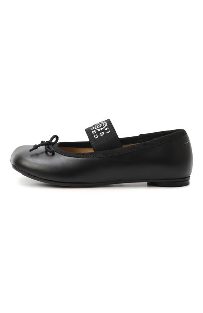 Балетки со скошенным мысом выполнили из гладкой мягкой кожи. Пару с отделкой из репсовой ленты вдоль выреза и бантом на союзке дополнили эластичной перемычкой с фирменным числовым кодом.