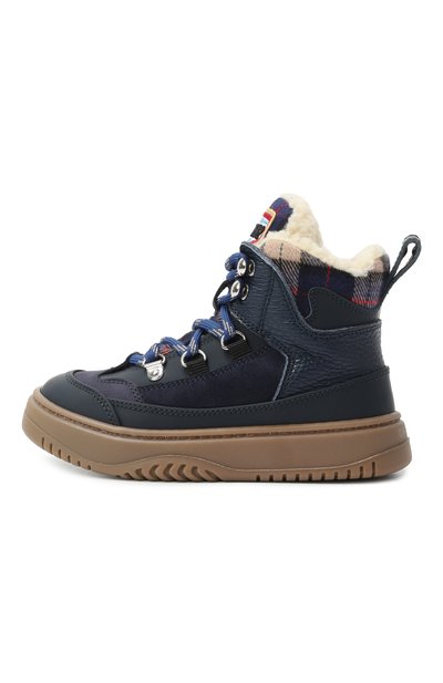 Для изготовления ботинок с утеплителем из напоминающего овчину текстиля использовали комбинацию клетчатой фланели, гладкой и крупнозернистой кожи. Модель с боковой молнией установили на подошву с рифленым протектором и украсили брендированным патчем на язычке.