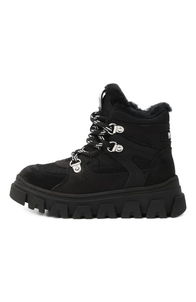 Для пошива ботинок на сплошной брендированной подошве выбрали комбинацию телячьих замши, гладкой и зернистой кожи. Верх модели подчеркнули вставкой из клетчатого текстиля, а язычок из такой же ткани украсили фирменным патчем. Пару с усиленной шнуровкой и боковой молнией утеплили контрастным экомехом.