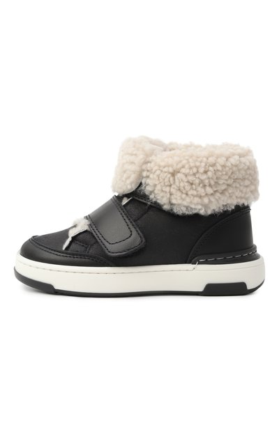 Ботинки с двумя ремешками-велкро сшили из металлизированной кожи. Модель с широкой подошвой из термопластичной резины отделали внутри и снаружи густой овчиной.