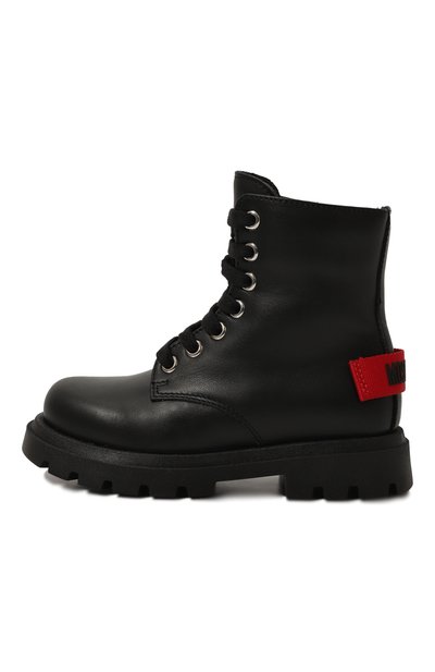 Ботинки с протекторной массивной подошвой и круглым мысом сшили из гладкой кожи. Модель со шнуровкой и молнией украсили сбоку брендированным бантом с заклепкой-сердцем.