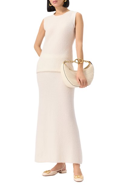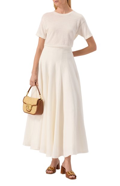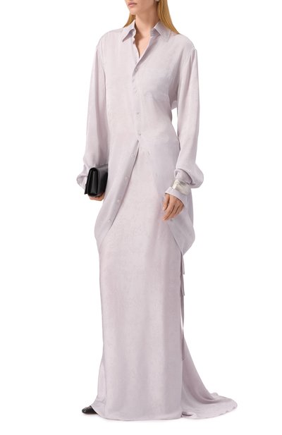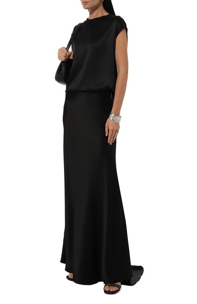 Длинную юбку, скроенную по косой, дополнили клиновидным шлейфом сзади. Модель с узким поясом изготовили из шелковой ткани, сотканной на мануфактуре Serica, основанной 1870 году.