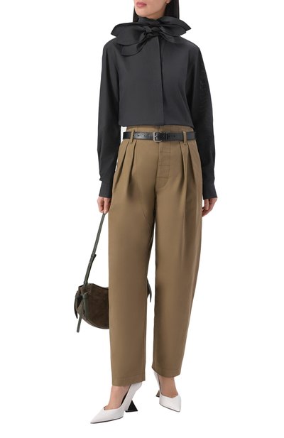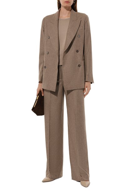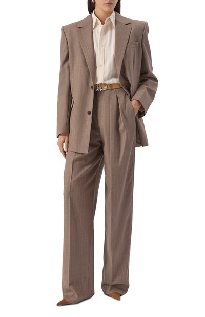 Брюки из микса шерсти и шелка составят элегантный дуэт с парным жакетом. Модель с высокой посадкой дополнили защипами, переходящими в отутюженные стрелки. Помимо боковых карманов предусмотрели задние на пуговицах.
