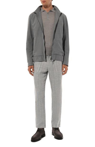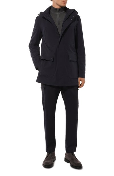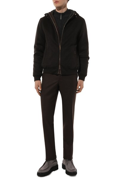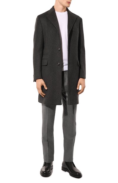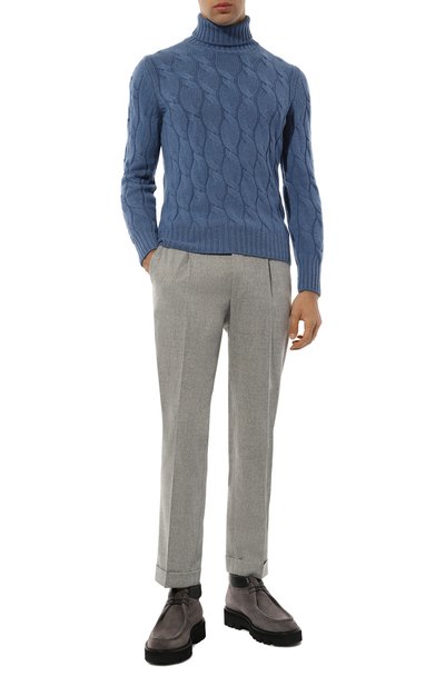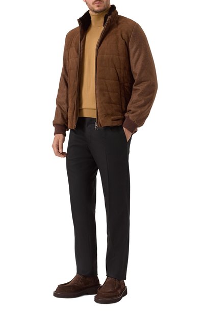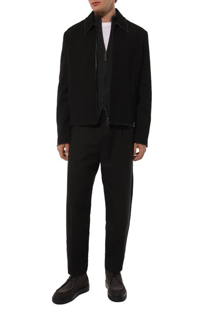 Ботинки с затемненным миндалевидным мысом сшили вручную из замши. Модель с тонким кожаным кантом вдоль выреза дополнили массивной протекторной подошвой.