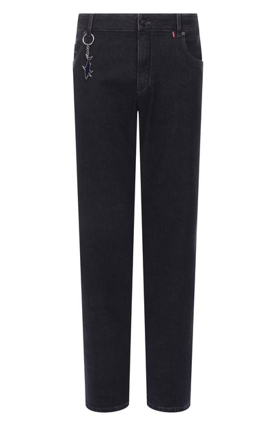 Джинсы выполнили из хлопкового денима. Три из пяти карманов украсили вышитыми акульими плавниками, а пояс — брендированным патчем и фирменной петлей. В комплект включили эмалевый брелок-акулу.