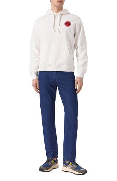 Зауженные джинсы выполнены из эластичного хлопкового денима с добавлением полиэстера и лиоцелла. Самый маленький из пяти карманов украшен вышитой эмблемой. Модель с брендированным патчем на поясе дополнена фирменным платком.