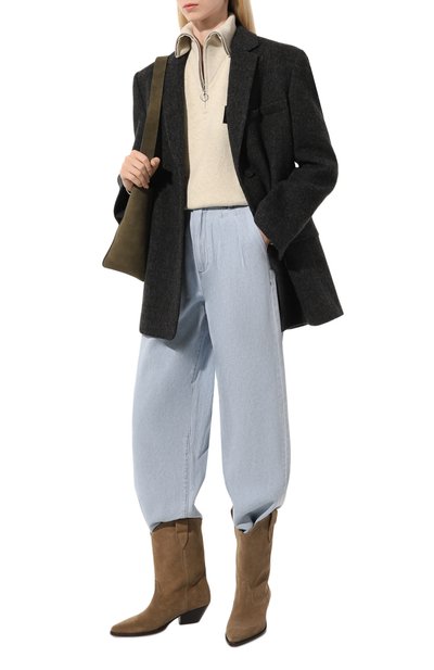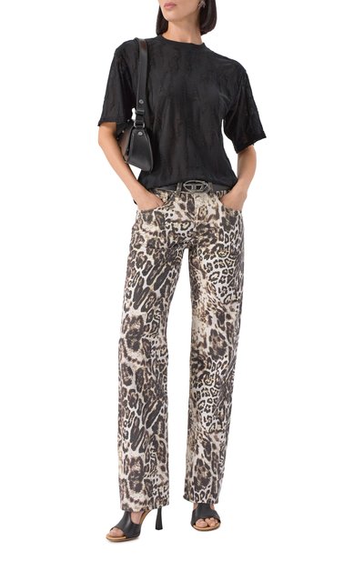 Джинсы Black Cheetah из коллаборации с Mowalola выполнили из смесового денима стрейч на основе хлопка. Модель с леопардовым узором украсили сзади фирменными эмблемами T-box и 4x4, а также патчем с символикой обеих марок. Изделие с низкой посадкой застегивается молнией слева.