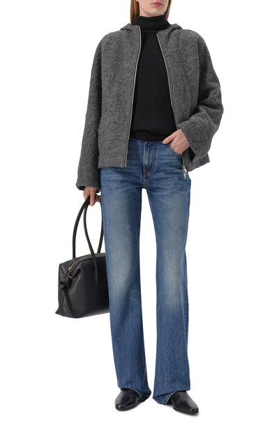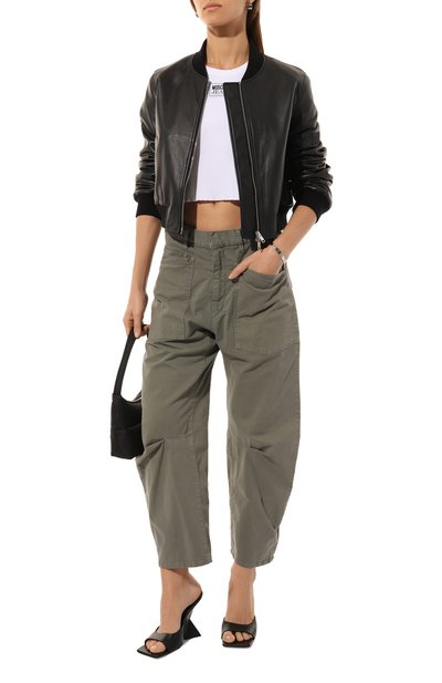 Бомбер силуэта oversize создан в коллаборации с Mowalola из хлопкового денима с гепардовым принтом. Куртка с горловиной, манжетами и поясом из трикотажа в рубчик дополнена рваными вставками сзади и эмблемой марки спереди. Модель с тремя карманами застегивается молнией.
