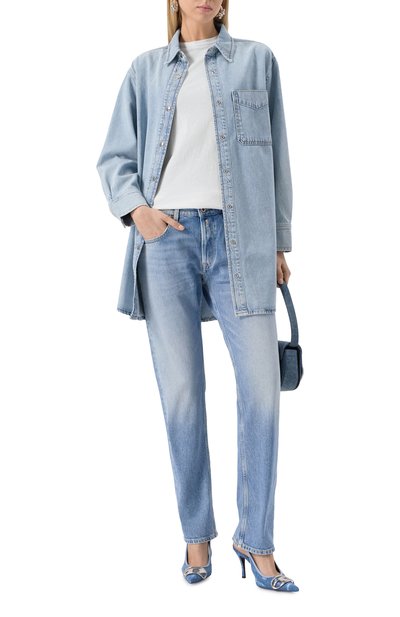 Футболка со спущенной линией плеч и круглой горловиной выполнена из хлопкового джерси. Однотонная модель свободного кроя легко впишется в базовый гардероб.