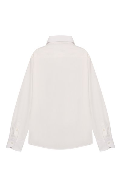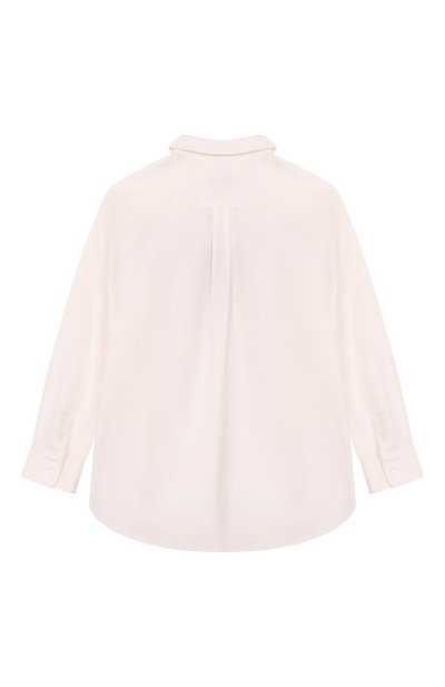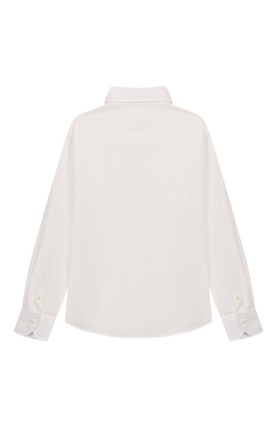Рубашку с отложным воротником, встречной складкой на спинке и скошенными манжетами выполнили из тонкой хлопковой ткани. Спереди модель декорировали небольшой литерой V, вышитой нитью в тон.