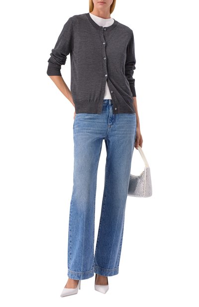 Джинсы с пятью карманами украсили фирменным жакроном на поясе сзади. Выбеленные брюки с заломами в местах сгиба ткани изготовили из денима средней плотности.