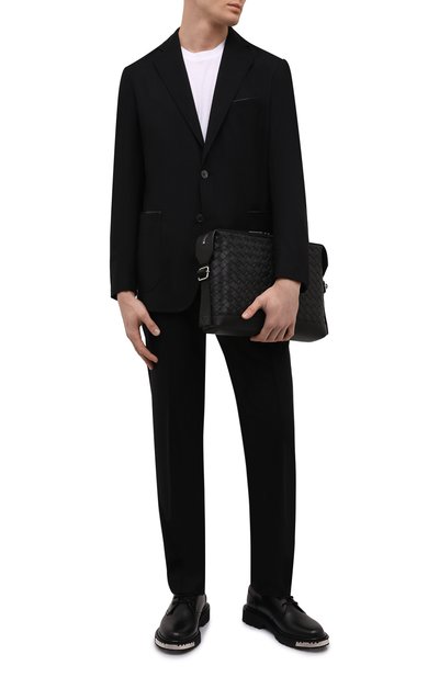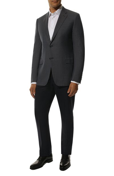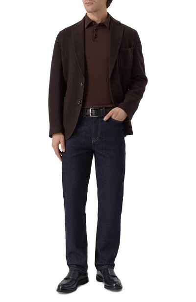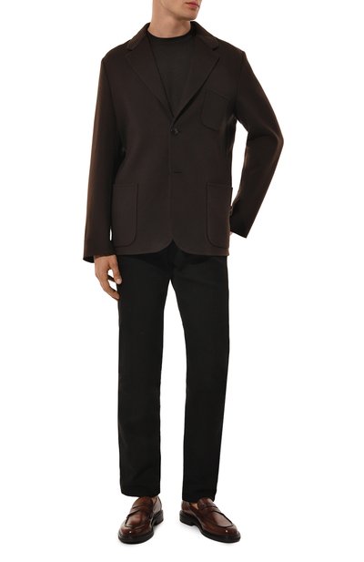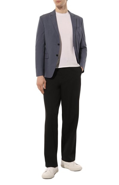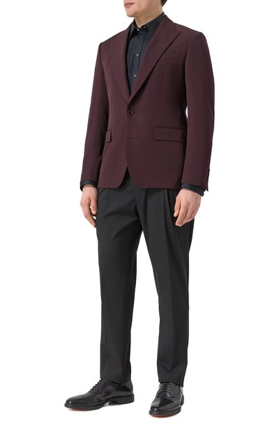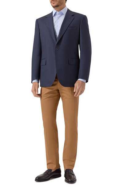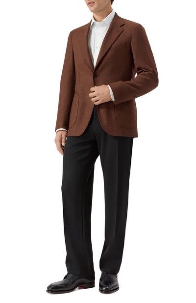 Для пошива однобортного пиджака Cavallo с укороченным подкладом использовали костюмную ткань из чистой шерсти. Модель на роговых пуговицах дополнена четырьмя внешними и двумя внутренними карманами.