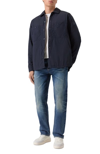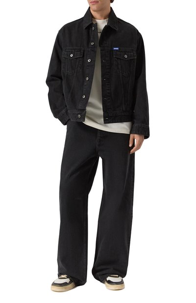 Джинсовую куртку сшили из хлопкового денима с потертостями. Модель с двумя парами карманов и патами на поясе украсили спереди и сзади брендированными патчами разных размеров.