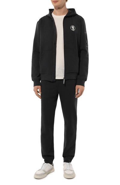 Выбеленную толстовку с двумя накладными карманами и спущенной линией плеч выполнили из хлопкового трикотажа. Модель, украшенная логотипом на груди, застегивается молнией.