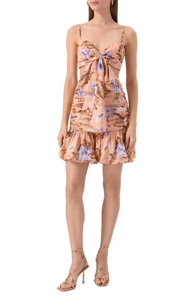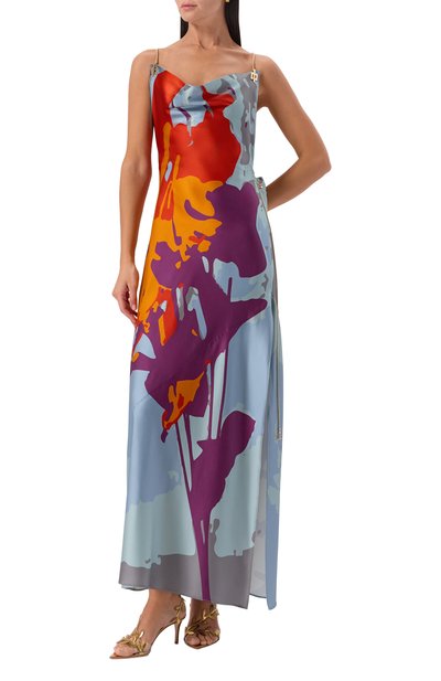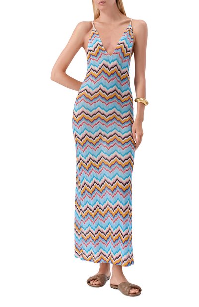 Длинное полупрозрачное платье с открытым плечом и обнажающим талию вырезом станет основой пляжного образа. Модель с фирменным принтом выполнили из тонкого полиэстерового трикотажа Raschel.