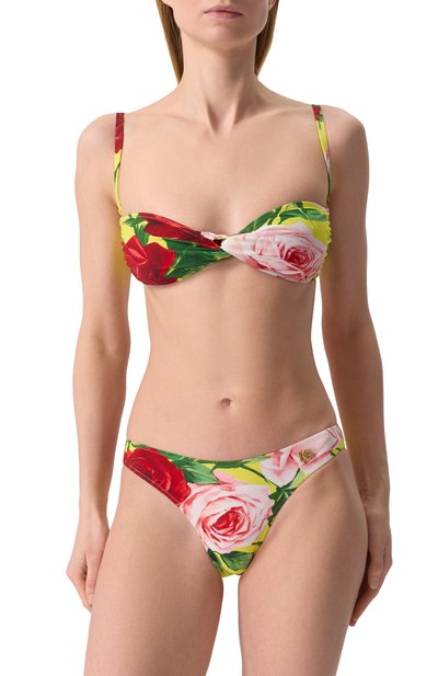 Раздельный купальник в крупную клетку выполнили из вискозного трикотажа Raschel с добавлением металлизированных нитей и дополнили подкладом из эластичного нейлона. Бра с широким поясом без застежки зашнуровывается спереди.