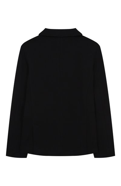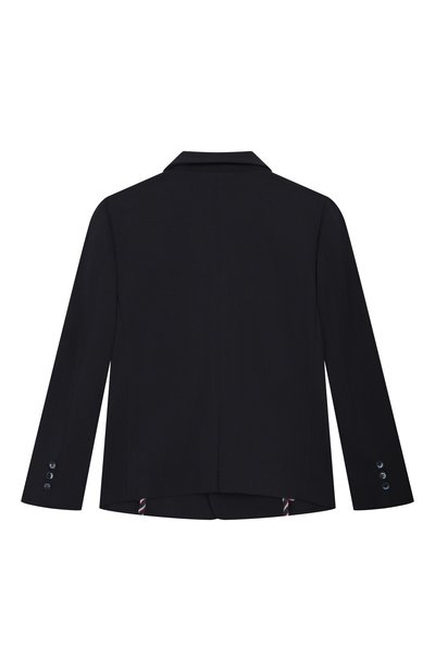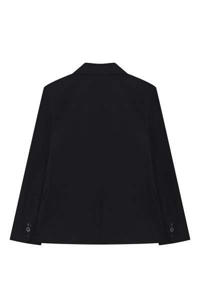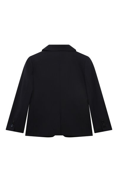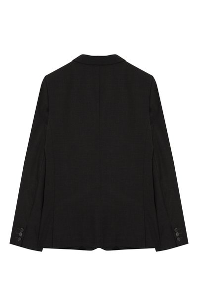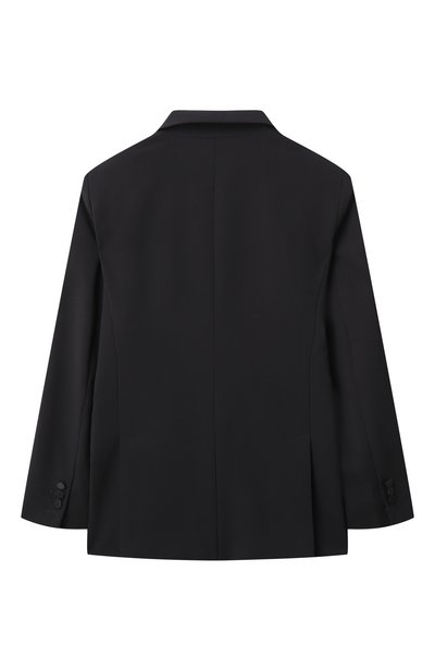 Пиджак изготовили из костюмной ткани с добавлением шерсти. Модель со шлицей сзади дополнили атласными лацканами, пуговицами и кантом на клапанах боковых карманов.