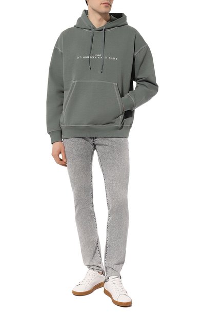 Зауженные джинсы Skater из хлопкового денима стрейч дополнили декоративными потертостями и разрывами. Вы беленную модель с пятью карманами украсили брендированным патчем на поясе, а ширинку button fly подчеркнули ярлыком фирменного алого оттенка.