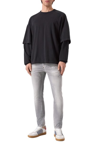 Зауженные джинсы Skater из хлопкового денима стрейч дополнили декоративными потертостями и разрывами. Выбеленную модель с пятью карманами украсили брендированным патчем на поясе, а ширинку button fly подчеркнули ярлыком фирменного алого оттенка.