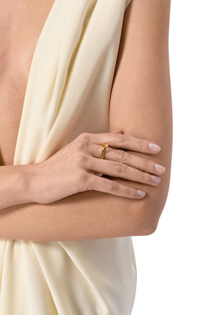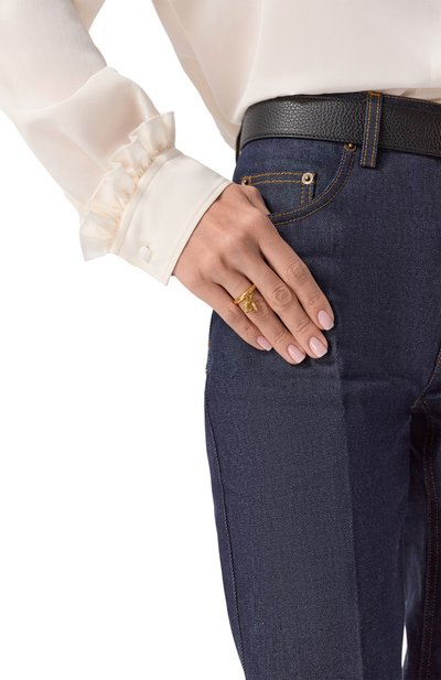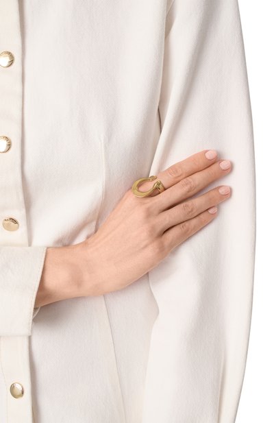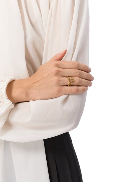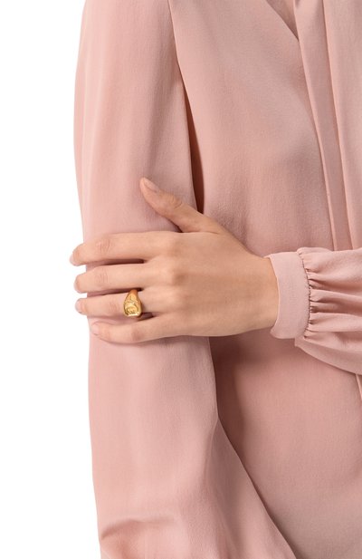 Крупное кольцо с выгравированным логотипом на шинке изготовили из латуни. Аксессуар с накладкой в форме пера украсили цирконами и имитацией жемчуга.