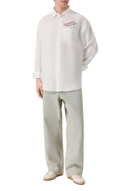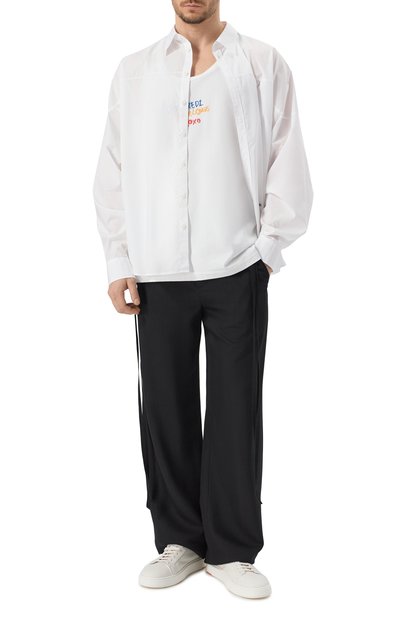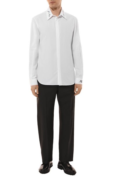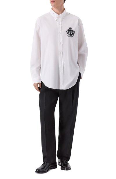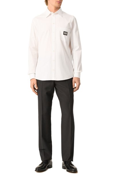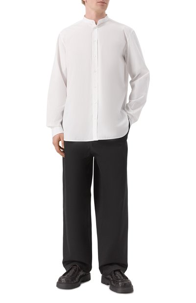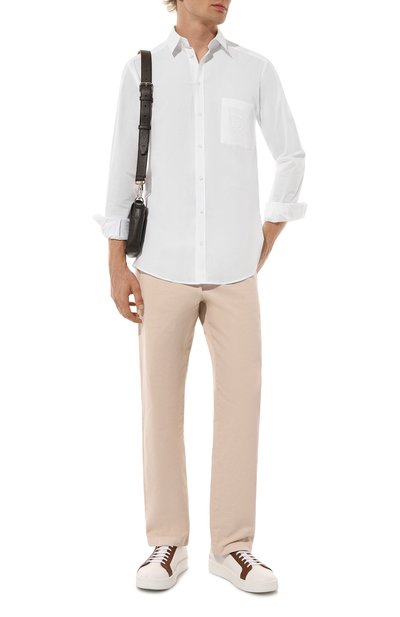Рубашку с супатной застежкой, прямоугольными манжетами и фигурным низом сшили из хлопкового поплина. Нагрудный накладной карман украсили вышивкой Ecusson в тон.