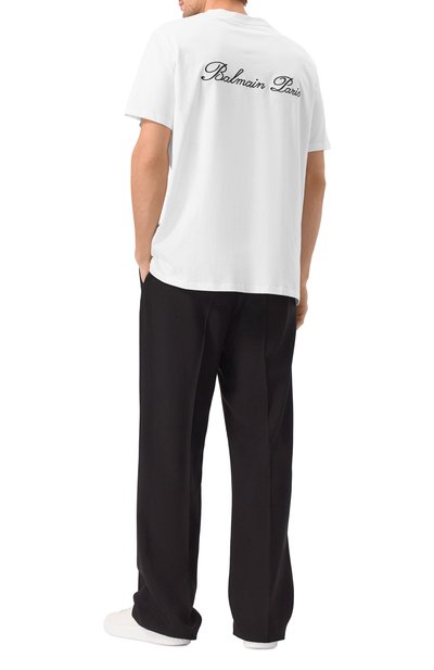 Футболку с круглой горловиной декорировали небольшим контрастным принтом Balmain Stamp снизу. Для пошива модели кроя Regular fit выбрали джерси из органического хлопка.